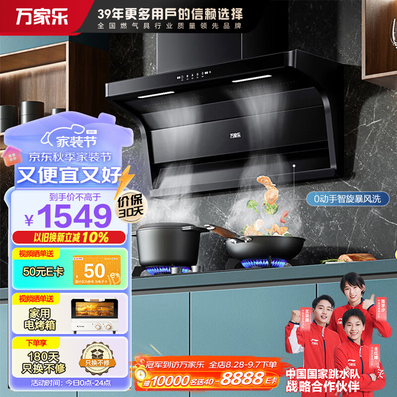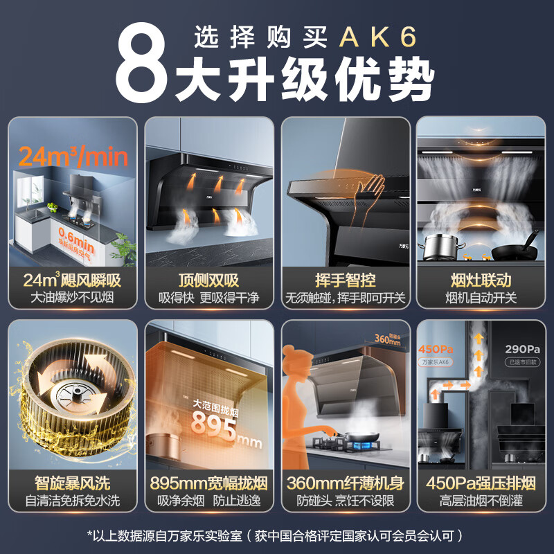 万家乐 抽油烟机 顶侧双吸油烟机 7字型家用自清洗烟灶联动24立方挥手感应大吸力油烟机CXW-300-AK6价格:1749.00元!