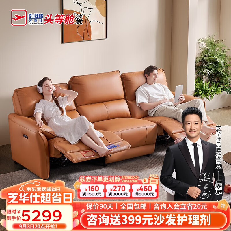 芝华仕(CHEERS)头等舱零靠墙现代简约真皮功能沙发直排轻奢芝华士11323橙三双A价格:5299.00元!