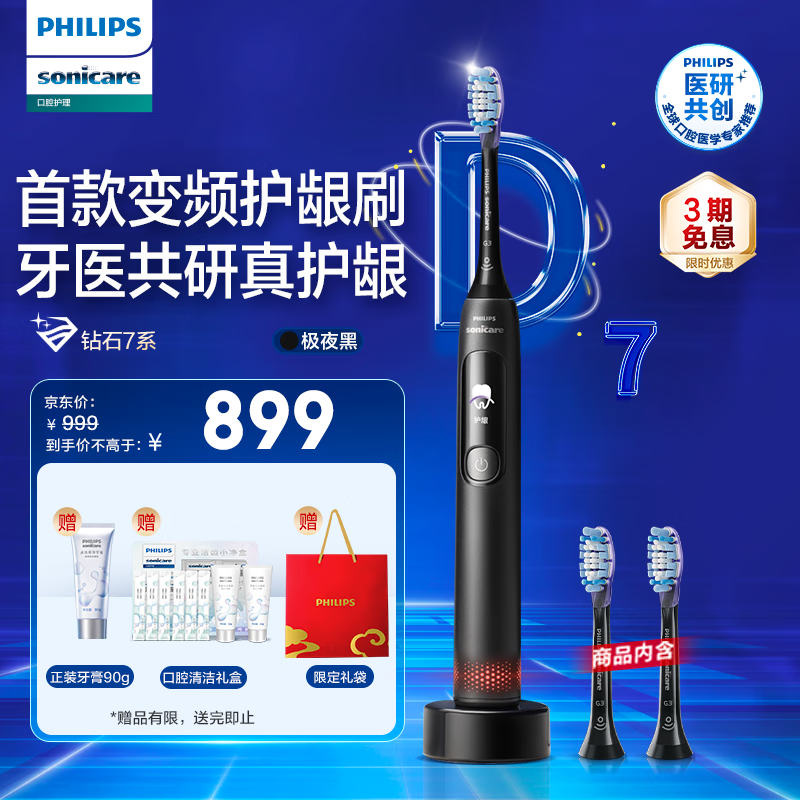 飞利浦(PHILIPS)电动牙刷 钻石7系情侣款送男女友礼物教师节中秋节 5种模式智能显示屏2支护龈刷头极夜黑HX3792/01价格:999.00元!