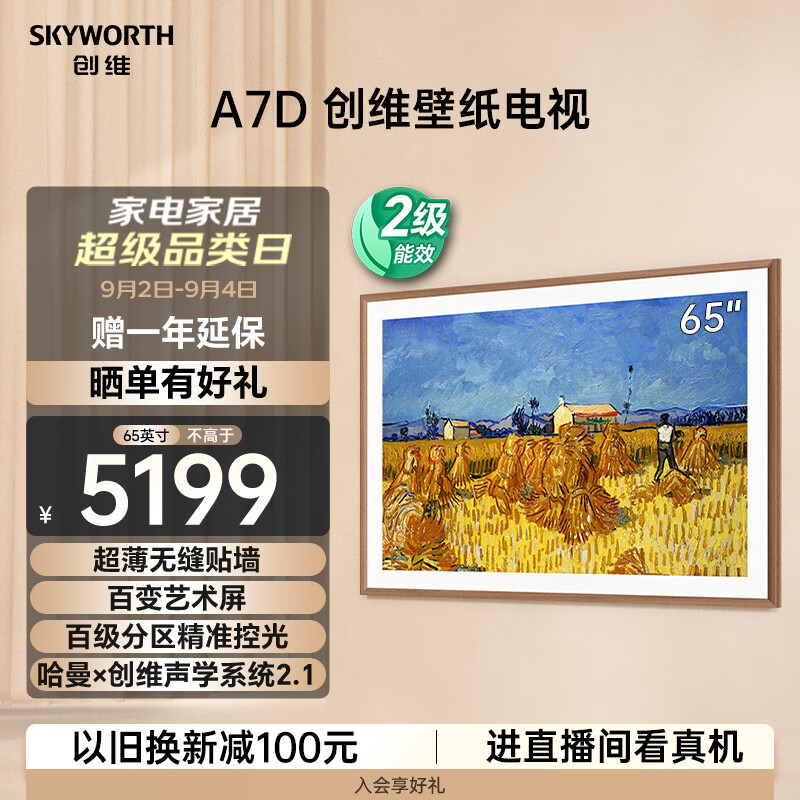 创维壁纸电视65A7D 65英寸超薄壁画艺术电视机 无缝贴墙百变艺术屏 4K高清 240Hz高刷液晶电视价格:5199.00元!